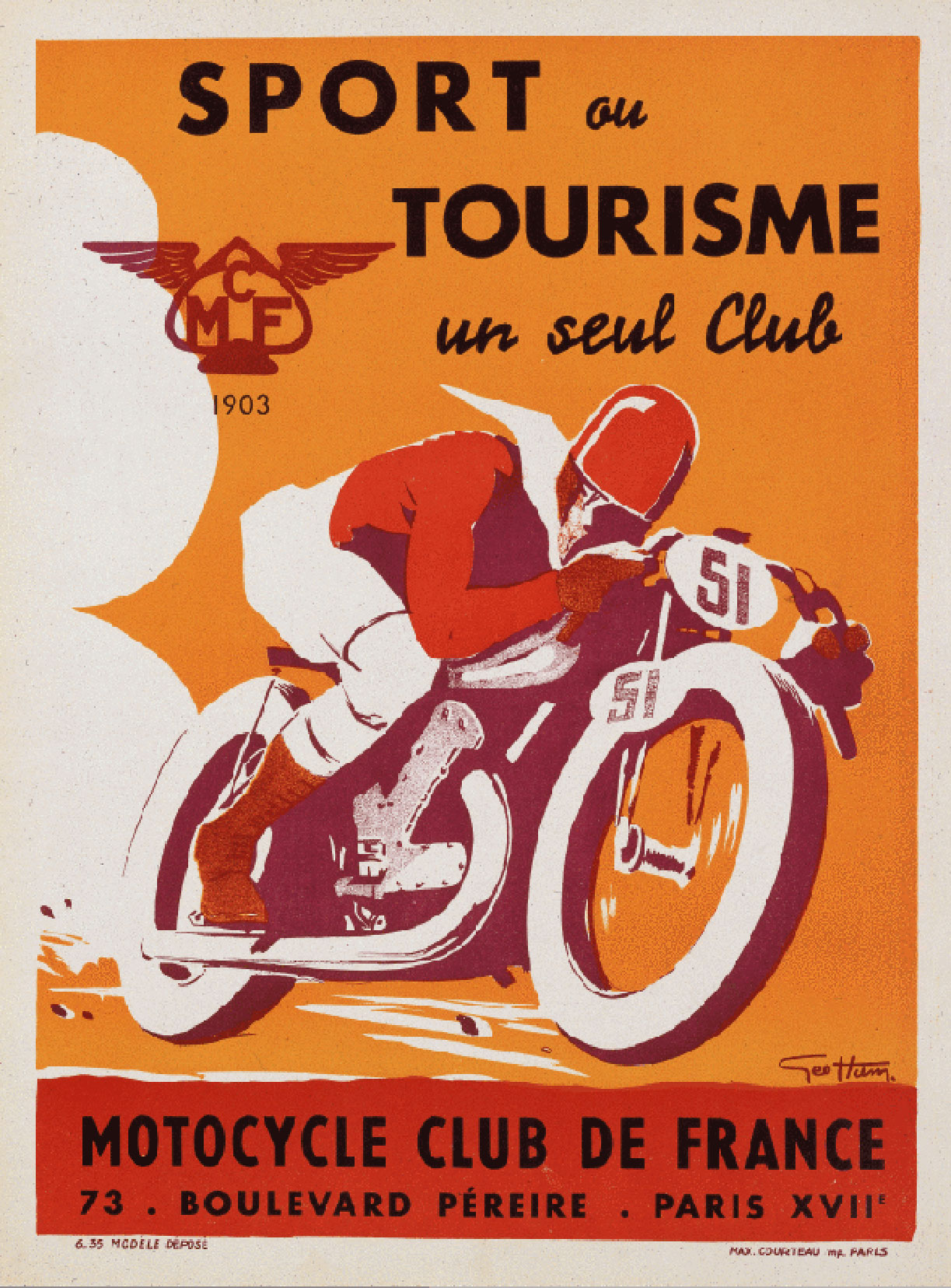 Any original Geo Ham poster will sell for between $700 and $2500, depending on the image. This image traditionally is found as a blank image with no text. It was designed in the 1930’s for the Motocycle Club de France (French Motorcycle Club). Sometime in the 50’s it was used with text by the French Motorcycle Club to boost membership. There are rarely versions of the 1950’s poster that are original. It has been reproduced and the copies are available on eBay regularly and often peddled as originals. I hooked on to this one on eBay France and was intrigued by the photo and description in French stating that it was an “old” poster that had edge wear on the yellowed paper. The opening bid was 100Euro and after a day or so I hit it with a minimum bid to avoid having the seller take it down. I figured I would snipe it at the end when I saw if it was getting any action. I thought it might be real but knew if it was that it would get hit and bid up during its run. With 2 days to go it still had no additional bids. I began to panic, thinking that I was going to take a 100Euro bath on a fake. To encourage someone to outbid me I posted the link on Pinterest and told people to jump on it. With one day to go someone outbid me. It was at 101Euro. I obsessed over the listing now that someone bid, not knowing if they knew more than I did and knew it was real. It forced me into high gear on my research. I contacted my dealer contacts and asked if anyone had info on the fakes that might confirm this was real. Nobody had owned a copy of the poster with the words. I went back to the eBay listing and started looking at every detail of the photo and comparing it to the photos of the repros I had. The colors looked correct and the edge wear in the photo looked correct from the low quality photo they had posted. I decided that I would put in a maximum bid that wouldn’t get me a divorce and chalk it up to education if I won it and it was a reproduction. I figured that the snipers would outbid me anyway if they did their homework and felt the same way I did about its authenticity. I guessed I would either win a fake, or it would go for somewhere in the $300 – $500 range. Bam! The auction went down and I won it for 25 cents less than my max. Now I was in complete panic that nobody had bid the $500 and went back to cussing myself for bidding on an uncertain commodity. Nothing to do but wait for the mail. 2 weeks later a small tube arrived and I actually waited a whole day before opening it because I was pissed at myself. When I cracked the seal and looked down the barrel of the tube my spirits were lifted. The paper looked correct and the edge wear was old. Even if it was a repro it was a vintage repro, which I could possibly live with. I slid it out and unrolled it to discover that the silkscreen was correct and the lettering had been screened on top of the original image, instead of embedded as it would have been on a fake. It was real! Sometimes the repro market can work to your advantage by scaring off the competition. I only say that because I have made some mistakes over my years of collecting posters and rarely take the chance anymore. My advice is still to buy from a reputable dealer and do your homework, unless you don’t care if it isn’t real and you paid too much…
